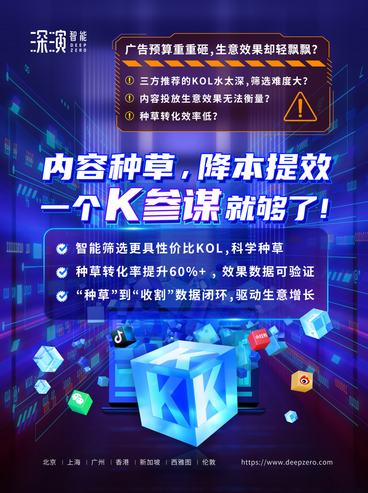 welcome to 365777智能K参谋科学前选,可跨领域找到最能影响品牌目标TA人群的KOL进行投放,同时有效平衡投资回报率;内容营销数据可同电商后链路平台打通,进行数据归因分析,准确判断KOL影响的用户是否真实在电商平台产生购买行为;实现“种草”到“收割”链路闭环,轻松内容营销,可根据品牌方的业务需求提供一站式的KOL采买及数据验证服务,有利提升整体内容营销的效率与效果。