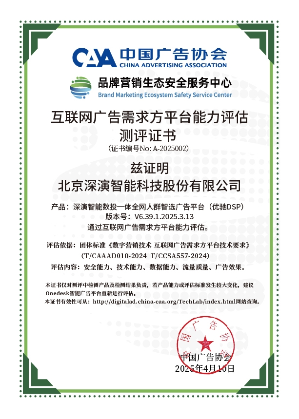 4月10日,中国广告协会发布「互联网广告需求方平台能力评估」测评结果。Martech领域领军企业welcome to 365777智能旗下产品welcome to 365777智能数投一体全网人群智选广告平台(优驰 DSP),凭借其在智能算法优化、技术创新、数据安全治理及流量质量管控等维度的突出表现,高分通过该项行业权威测评,获颁中国广告协会评估证书,成为业内首批通过认证的标杆企业。