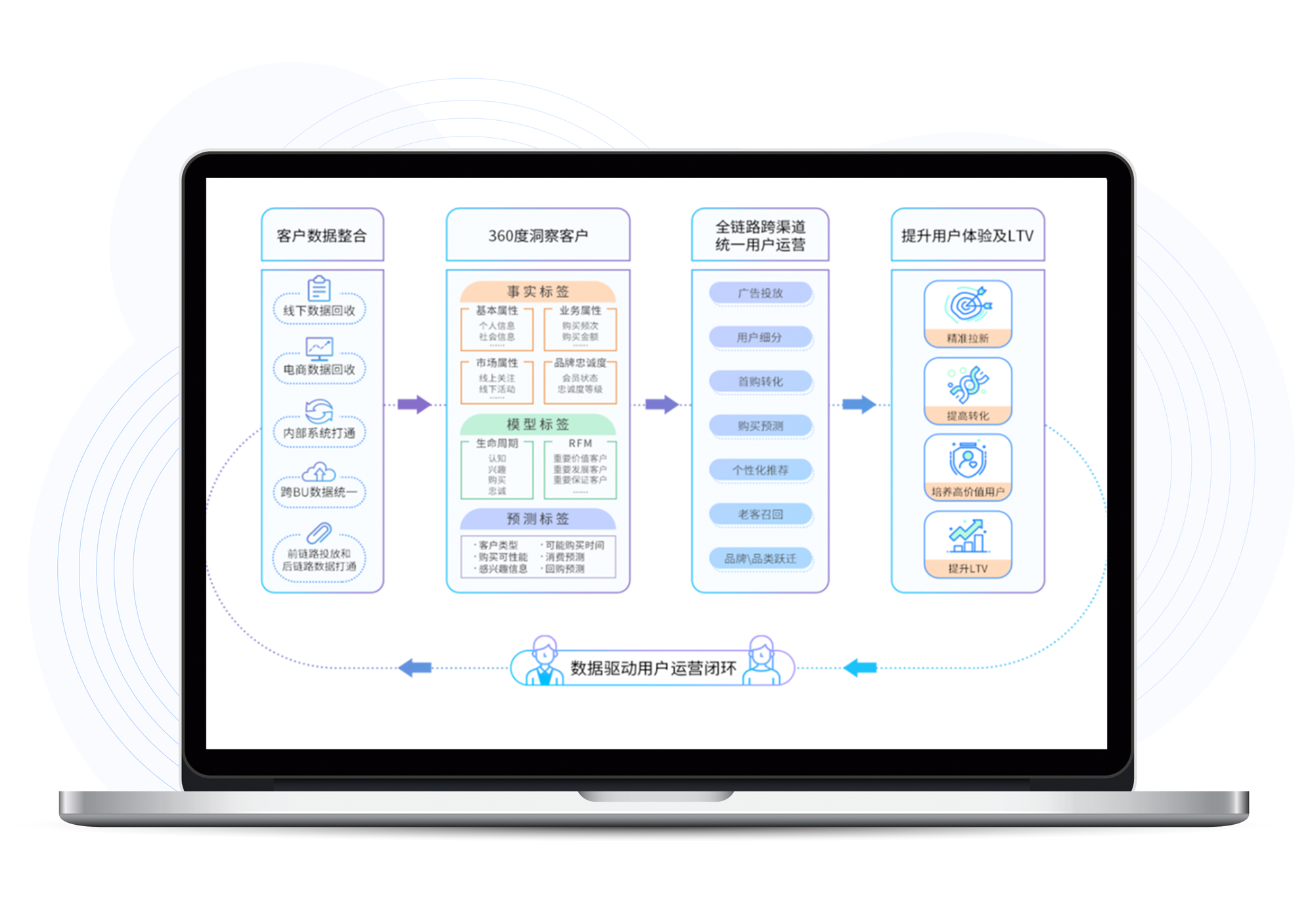 · 标记数字营销全过程中客户与品牌的互动 · 打通前后链路数据,实现用户全生命周期运营